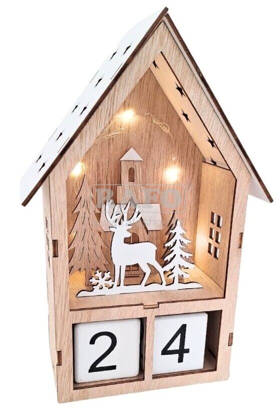 Dřevěný domeček s LED a kostičkami s čísly Zkraťte si čekání na Ježíška s tímto originálním adventním kalendářem! Domeček se sobem a LED osvětlením vykouzlí tu pravou vánoční atmosféru i ve vašem domově. Baterie 3x LR44 jsou součástí.