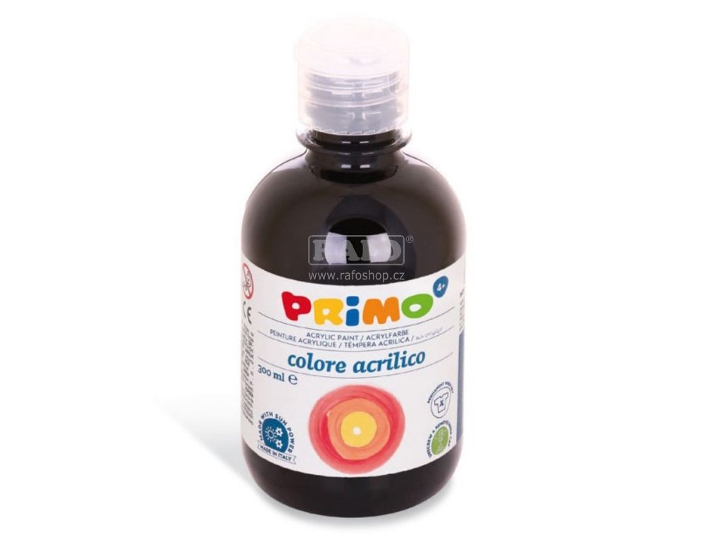 Akrylová barva PRIMO v lahvičce obsahuje vysoké množství pigmentu. Plastová lahvička s dávkovačem a plastovou čočkou pod víčkem, která brání vyschnutí. Pokud plastovou čočku vrátíte po každém používání zpět, barva Vám vydrží mnohem déle. Barvy po zaschnutí nejsou vypratelné, nutno odstranit ihned teplou vodou a mýdlem. • lahvička 300 ml • velká krycí schopnost • vodou ředitelná • voděodolná • vhodné pro všechny savé podklady • jasné a syté odstínyDoplňkové parametry