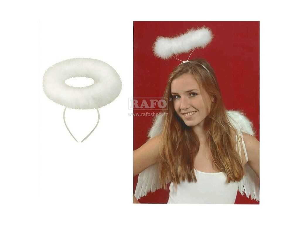 Čelenka s péřovou svatozáří na drátku. Karnevalová pomůcka, vhodná i pro party, halloween nebo pro masku Mikuláše / anděla / čerta. Velikost 30 cmDoplňkové parametry
