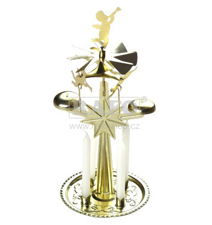 Andělské zvonění ve zlatém provedení, ve kterém se nádherně odráží světlo zapálených svíček. Tradiční vánoční dekorace na váš slavnostní stůl. Po zapálení svící se teplem svícen roztočí a andílci začnou jemně zvonit. Navoďte si tu správnou vánoční atmosféru. Součástí dodávky jsou 4 ks svíček. Velikost: 13 x 27 cm. Tip na dárek!
