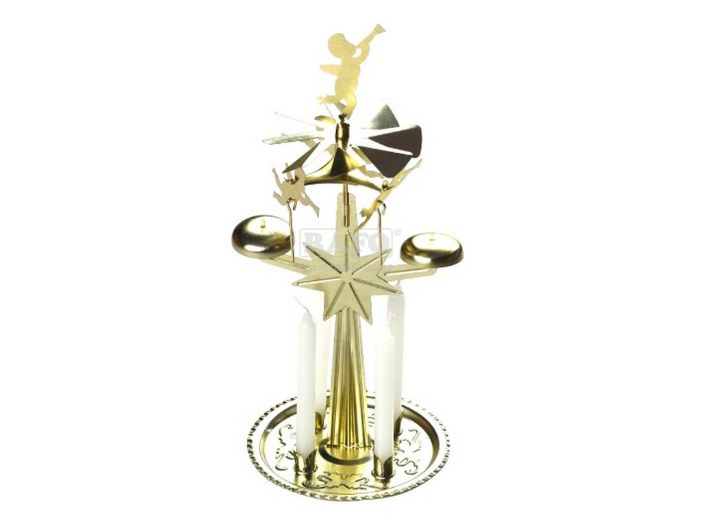 Andělské zvonění ve zlatém provedení, ve kterém se nádherně odráží světlo zapálených svíček. Tradiční vánoční dekorace na váš slavnostní stůl. Po zapálení svící se teplem svícen roztočí a andílci začnou jemně zvonit. Navoďte si tu správnou vánoční atmosféru. Součástí dodávky jsou 4 ks svíček. Velikost: 13 x 27 cm. Tip na dárek!Doplňkové parametry