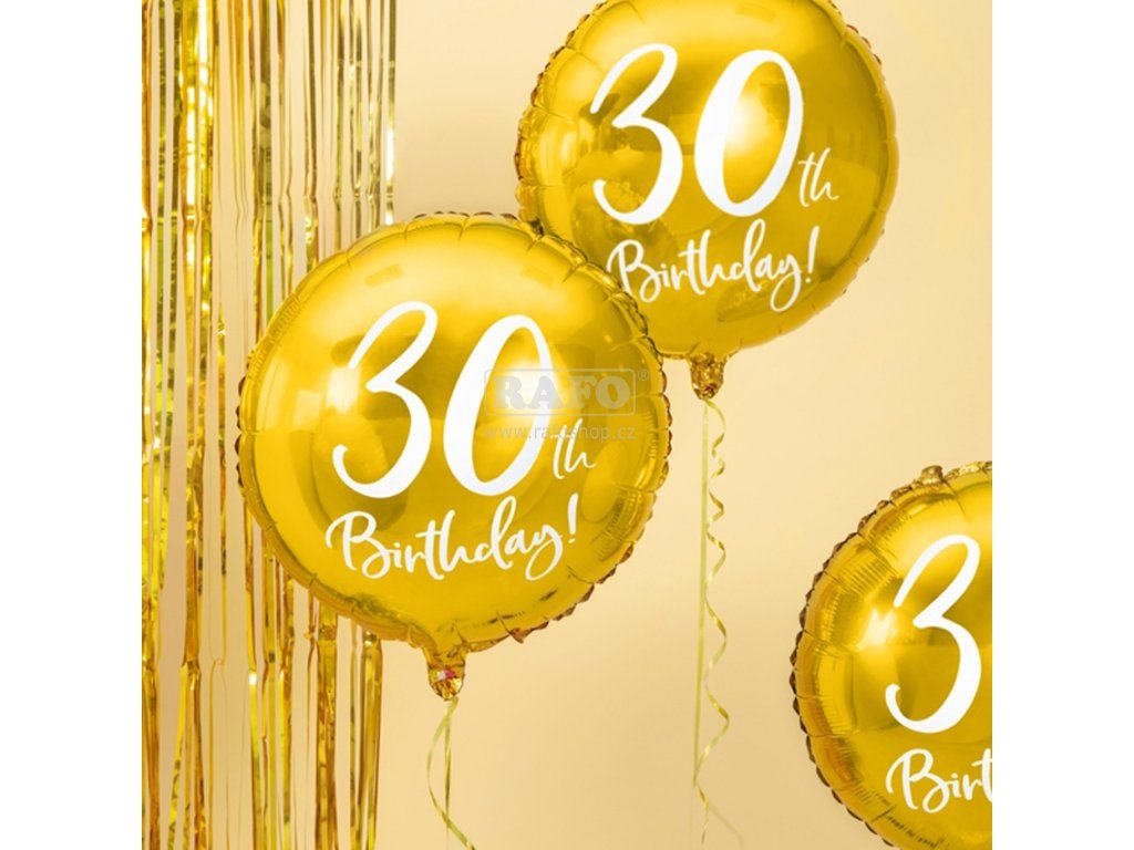 Fóliový balónek kulatého tvaru, ve zlaté barvě s nápisem 30th Birthday! Rozměr: 45 cm Lze nafouknout vzduchem i heliem. Perfektní doplněk silvestrovské párty či oslavy narozenin. K nafouknutí vzduchem můžete použít ruční pumpičku nebo brčko. K nafouknutí heliem si u nás můžete vybrat heliovou bombu - nebo Vám můžeme po domluvě balónek předat již nafouknutý.Doplňkové parametry