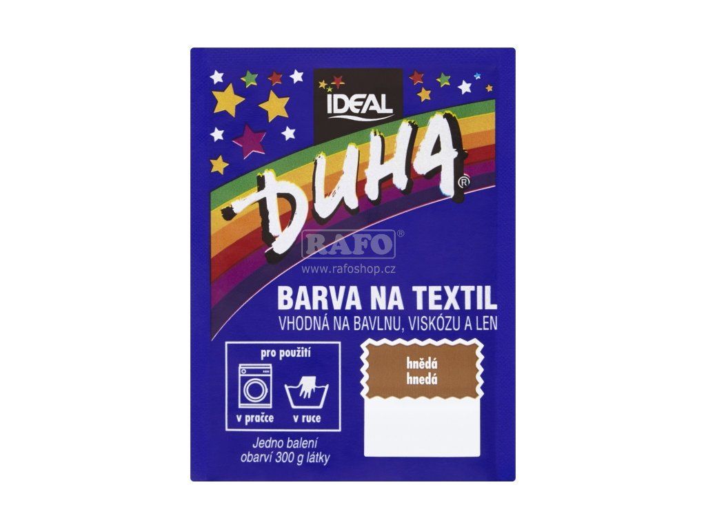 Barva na textil vhodná na bavlnu, viskózu a len. Pro použití v pračce či v ruce. Jedno balení obarví 300 g látky. Barvení v ruce: Obsah sáčku rozpusťte ve 1/4 l vroucí vody. Roztok nalijte do nádoby se 7-10 litry vlažné vody a přidejte 10 polévkových lžic kuchyňské soli (200 g). Ponořte barvenou látku do lázně, rovnoměrně rozprostřete a za občasného míchání přiveďte k varu. Udržujte takto při mírném varu 20 minut, potom odstavte a občas zamíchejte, až voda téměř vychladne. Barvenou látku potom máchejte ve studené vodě, dokud není voda čirá. Barvení v automatické pračce: Obsah sáčku rozpusťte ve 1/4 l vroucí vody a nalijte přímo do bubnu pračky. Přidejte 10 polévkových lžic kuchyňské soli (200 g). Vložte látku do bubnu a použijte program s nejvyšší teplotou (80-90°C) bez předpírání. Po ukončení cyklu látku vyjměte. Čištění pračky: Pro odstranění možných zbytků barvy nastavte program s nejvyšší teplotou (80-90°C). Přidejte do pračky minimální dávku pracího prášku a 200 ml bělícího přípravku (např. Savo Perex) spolu s kusem staré látky, který případné zbytky barvy pohltí.Doplňkové parametry