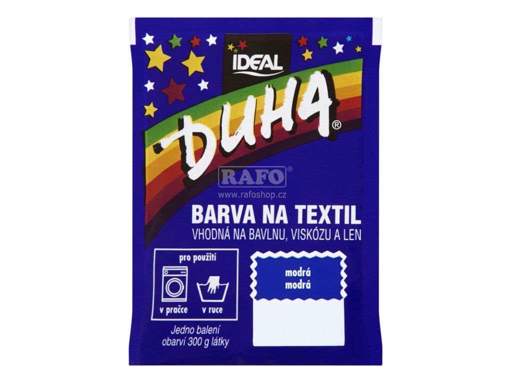 Barva na textil vhodná na bavlnu, viskózu a len. Pro použití v pračce či v ruce. Jedno balení obarví 300 g látky. Barvení v ruce: Obsah sáčku rozpusťte ve 1/4 l vroucí vody. Roztok nalijte do nádoby se 7-10 litry vlažné vody a přidejte 10 polévkových lžic kuchyňské soli (200 g). Ponořte barvenou látku do lázně, rovnoměrně rozprostřete a za občasného míchání přiveďte k varu. Udržujte takto při mírném varu 20 minut, potom odstavte a občas zamíchejte, až voda téměř vychladne. Barvenou látku potom máchejte ve studené vodě, dokud není voda čirá. Barvení v automatické pračce: Obsah sáčku rozpusťte ve 1/4 l vroucí vody a nalijte přímo do bubnu pračky. Přidejte 10 polévkových lžic kuchyňské soli (200 g). Vložte látku do bubnu a použijte program s nejvyšší teplotou (80-90°C) bez předpírání. Po ukončení cyklu látku vyjměte. Čištění pračky: Pro odstranění možných zbytků barvy nastavte program s nejvyšší teplotou (80-90°C). Přidejte do pračky minimální dávku pracího prášku a 200 ml bělícího přípravku (např. Savo Perex) spolu s kusem staré látky, který případné zbytky barvy pohltí.Doplňkové parametry