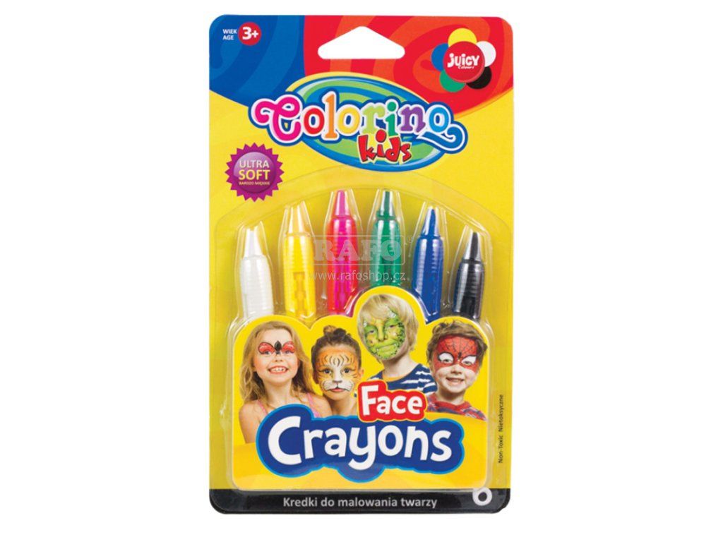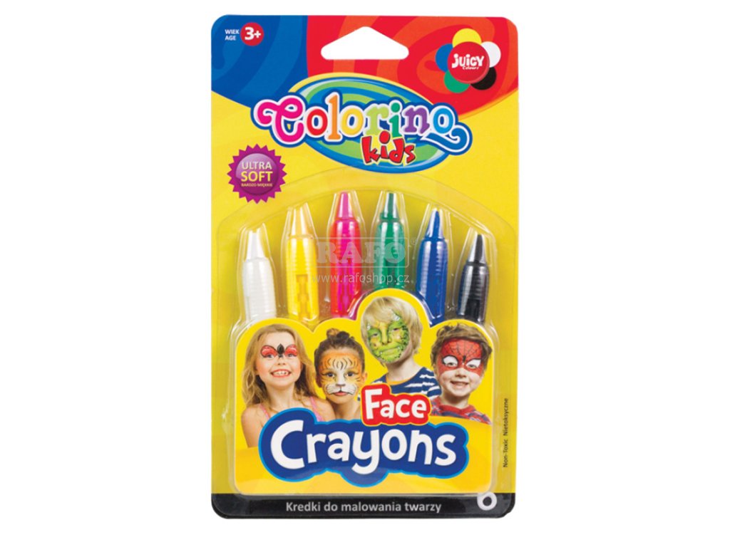 Barvy určené pro malování na obličej a tělo. Malování je čisté a snadné- barva v praktické plastové násadce. • lehce se nanáší • snadno odstranitelné • zdravotně nezávadné • délka voskovky: 95 mm • balení: 6 barevDoplňkové parametry