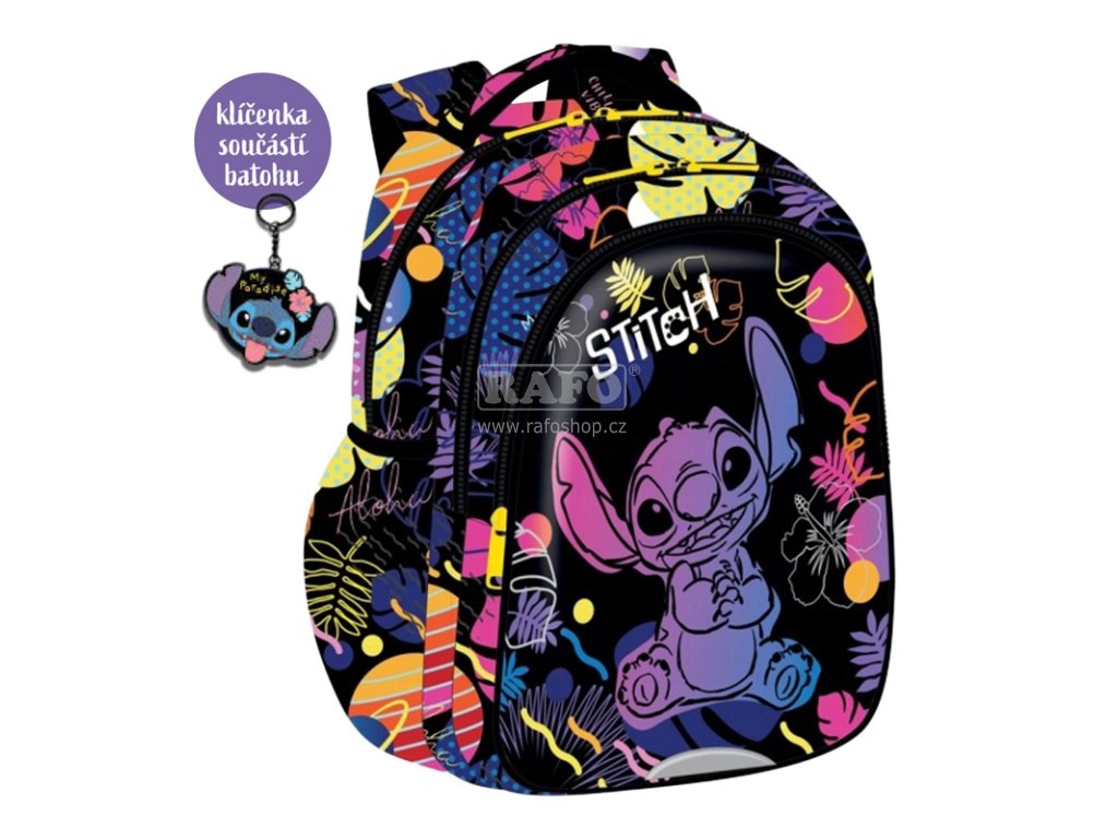 Vstupte do světa kouzel kolekcí Stitch Black! Barevné a zářivé motivy mimozemského Stitche okouzlí všechny malé fanoušky tohoto výjimečného příběhu. Dětský batůžek, který drží krok s každým neposedou. Hodí se na kroužky, volnočasové aktivity nebo malé výpravy. Tři praktické kapsy zip schovají veškeré poklady, vnitřní organizér s klíčenkou pro bezpečné uložení drobností. Polstrovaná záda, nastavitelné ramenní popruhy s hrudní přezkou a integrovanou píšťalkou zaručují pohodlí během nošení. Snadno přístupné boční kapsy jsou vhodné na láhev s vodou. Je voděodolný, reflexní prvky zajišťují lepší bezpečnost dítěte. Roztomilá klíčenka ve tvaru Stitche. • rozměry: š: 280 × v: 38 × h: 19 cm • velikost: 19 l • materiál: 100 % polyester • 4 kapsy na zip, 2 menší otevřené kapsy • voděodolný, reflexní prvky • poutko na zavěšení, polstrovaná zádaDoplňkové parametry