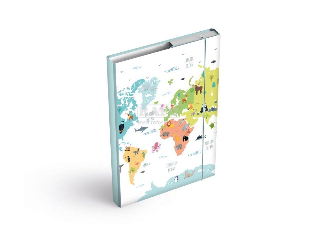 Školní desky na sešity ve velikosti A4 s motivem mapy světa. Jsou nezbytnou součástí vybavení každého školáka. Díky školním deskám budou všechny sešity a učebnice pohromadě a neponičené. Tyto desky na sešity jsou opatřeny gumou, která zabraňuje samovolnému otevření. Heft box je vyroben z kvalitního lepenkového kartonu, potaženého laminem. Z tohoto důvodu se dá velice lehce udržovat. Rozměr: 230 x 320 x 45 mmDoplňkové parametry
