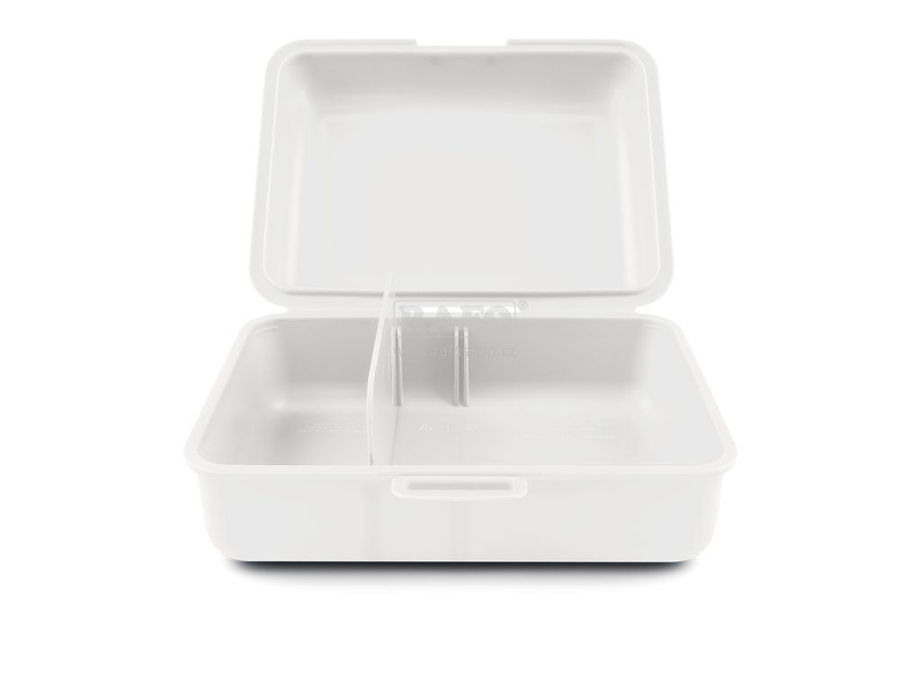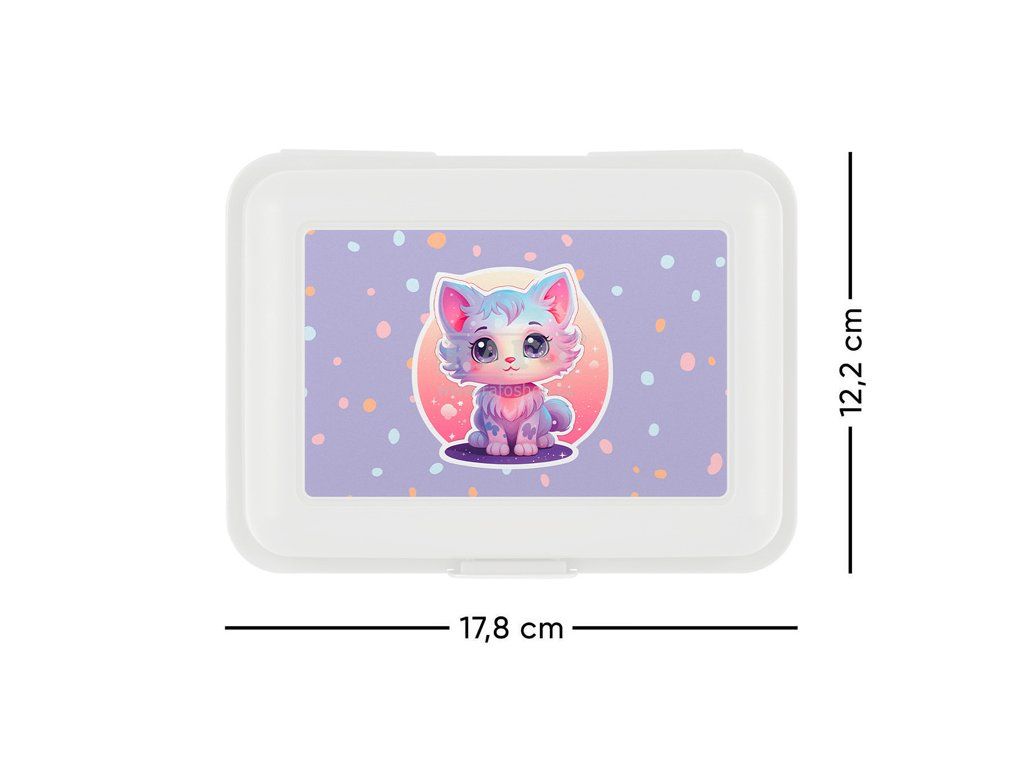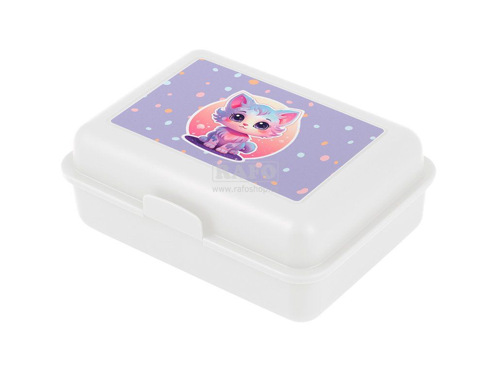 Praktický box na svačinu s motivem roztomilé kočičky. Zahrnuje polohovatelnou přepážku pro oddělení potravin. • Plastový box na svačinu v bílé barvě. • Box má uzavírání na jeden zámek a dělicí přepážku. • Nedoporučujeme mýt v myčce • Rozměry: 17,8 x 12,2 x 6 cmDoplňkové parametry