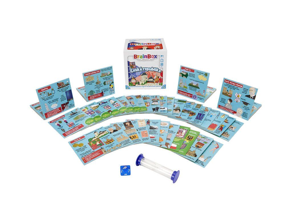 Zábavná a naučná karetní hra o celé České republice BrainBox je zábavná paměťová a postřehová karetní hra, která otestuje váš smysl pro detail. Co si zapamatujete za pouhých 10 vteřin? Vydání hry zaměřené na Českou republiku představuje kraje, oblasti, slavné osobnosti a mnoho dalšího z České republiky. BrainBox Česká republika obsahuje 55 karetních her, z nichž každá představuje nějaký kraj, národní park, významnou oblast nebo osobnost naší země. Na každé kartě jsou údaje o kultuře, zajímavých místech, historii a lidech této oblasti - díky ručně ilustrovaným obrázkům vám vše ožije doslova před očima. Hra pomáhá dětem dozvědět se více o své vlasti, a přitom rozvíjí kognitivní dovednosti, jako je postřeh a vybavování vzpomínek, které tvoří základ pro učení na celý život. • Obsah balení: 55 karet, pravidla, 1 přesýpací hodiny, 1 kostkaDoplňkové parametry