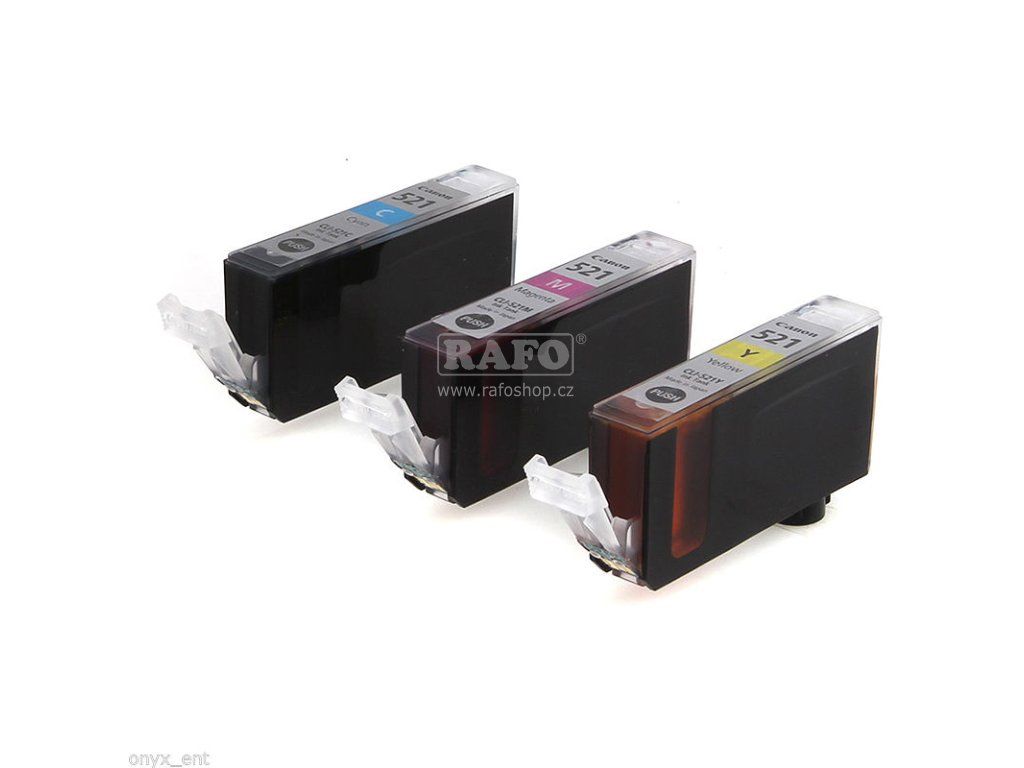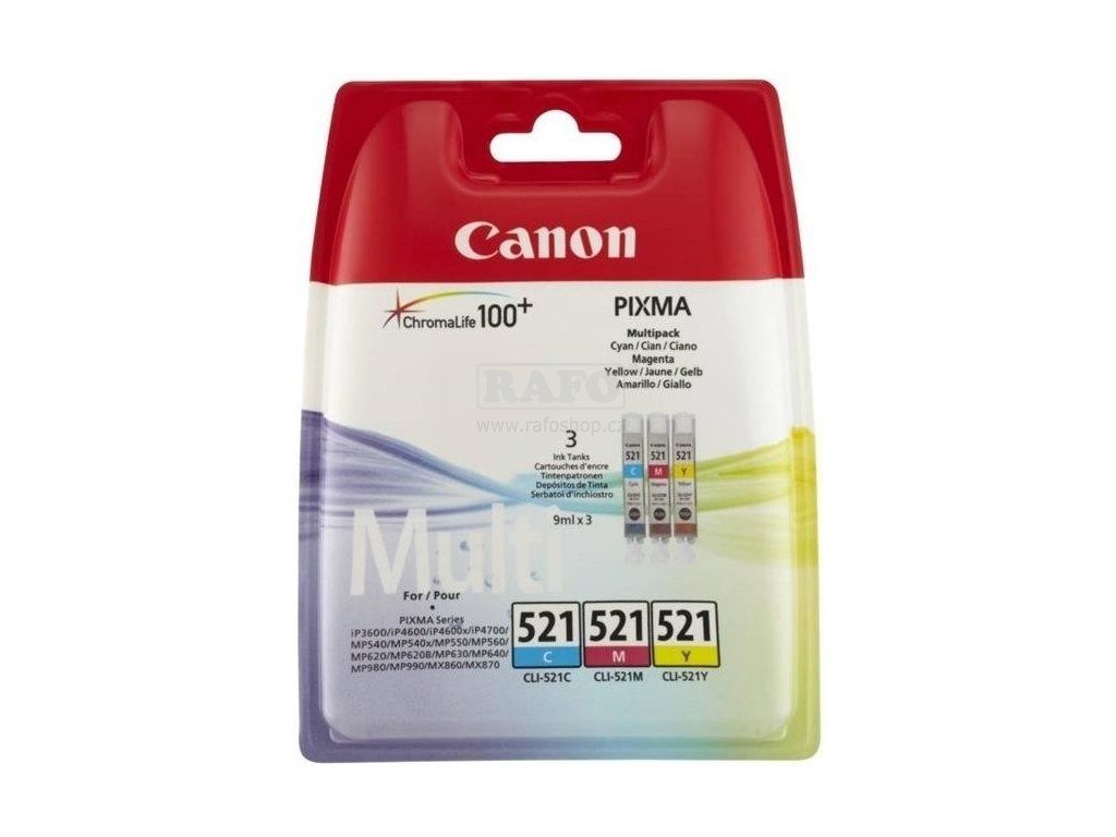 Náhradní sada originálních barevných cartridgí Canon CLI-521CMY Pack je určena pro barevné inkoustové tiskárny firmy Canon, modely řady PIXMA iP3600/iP4600 a řady MP540/620/630/980. Barva: azurová + purpurová + žlutá Obsah: 3 x 9 ml.Doplňkové parametry