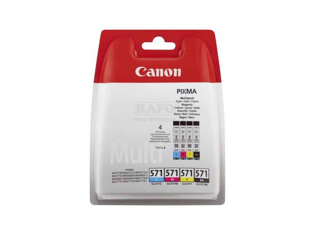 Originální cartridge CLI-571 C/M/Y/BK Multi pack. Barva: černá, azurová, purpurová, žlutá. Objem: 4 x 7 ml. Kompatibilita: Canon Pixma MG7750, Canon Pixma MG7751, Canon Pixma MG7752, Canon Pixma MG7753, Canon Pixma MG5750, Canon Pixma MG5751, Canon Pixma MG5752, Canon Pixma MG5753, Canon Pixma MG6850, Canon Pixma MG6851, Canon Pixma MG6852, Canon Pixma MG6853, Canon PIXMA TS 6050.Doplňkové parametry