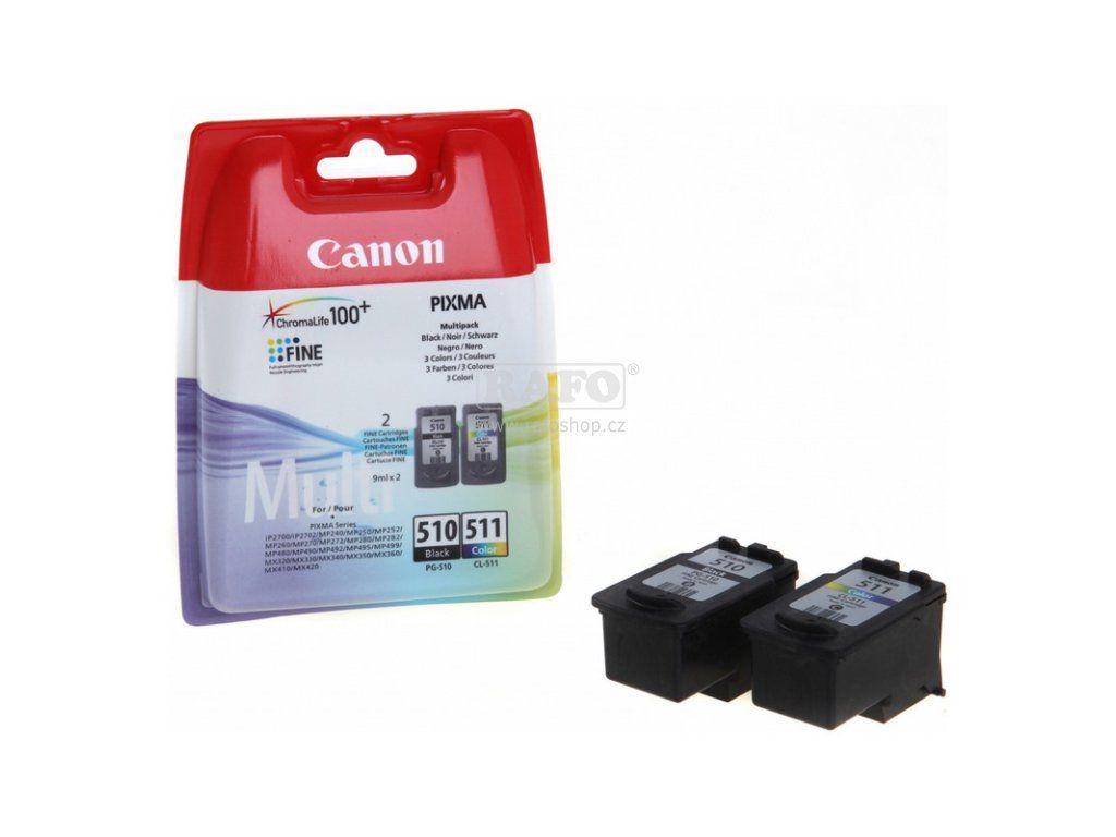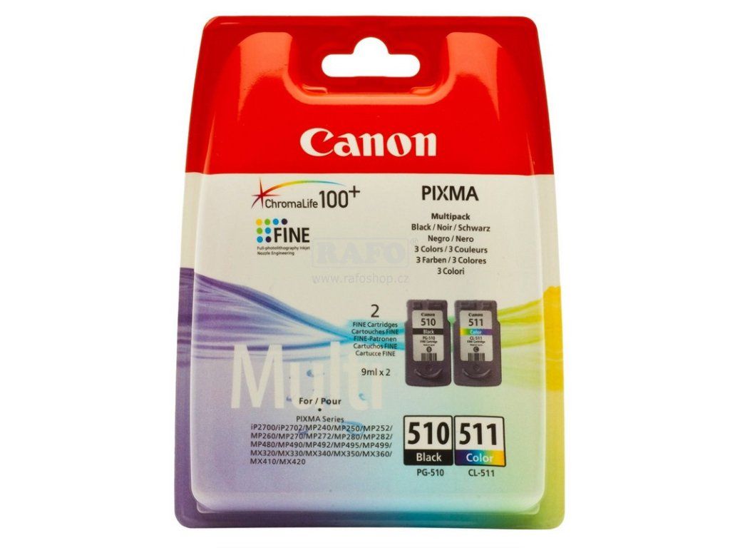Originální set 2 náplní Canon. Praktické balení obsahující černou (PG-510), a tříbarevnou (CL-511) azurovou, purpurovou a žlutou náplň. Toto balení je určeno pro inkoustové tiskárny Canon Pixma MP230, MP252, MP270, MP272, MP280, MP282, MP495, MP499, MX340, MX350, MX410 a MX420.Doplňkové parametry