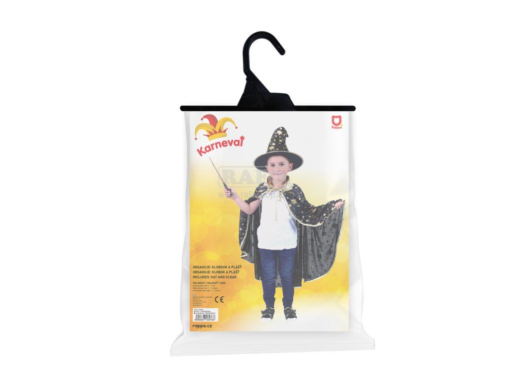 Perfektní souprava pro všechny čarodějnice nebo čaroděje na párty, karneval nebo oslavu Halloweenu! Balení obsahuje čarodějnický plášť černé barvy se zlatým lemováním a hvězdami a perfektně sladěný klobouk. V těchto exkluzivních doplňcích tě zaručeně nikdo nepřehlédne! Určeno pro děti od 3-7 let. Délka 72 cm. Hůlka není součástí balení.Doplňkové parametry