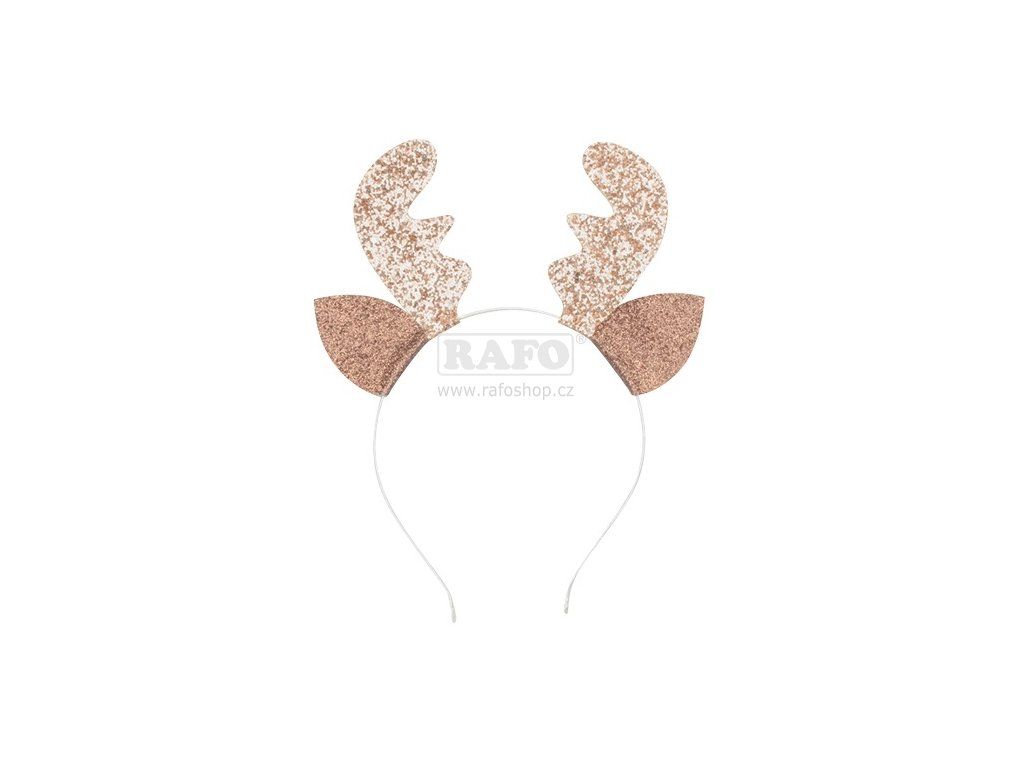Kovová čelenka obalená krémovou stuhou, ozdobená pevnými třipytivými parohy a uši.Doplňkové parametry