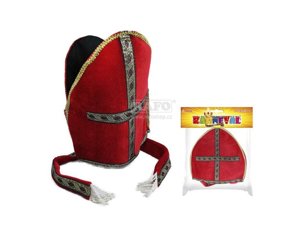 Mikulášská čepice - mitra. Čepice má obvod cca 50 cm. Karnevalová pomůcka, vhodná i pro party, halloween nebo pro masku Mikuláše / anděla / čerta.Doplňkové parametry