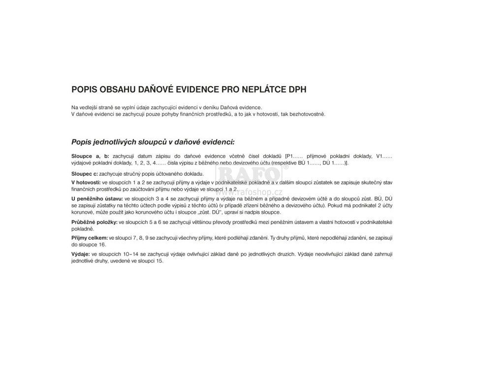 Daňová evidence pro neplátce DPH nahrazuje dřívější "Peněžní deník pro neplátce DPH" • nepropisovací • formát A4 na šířku • 32 listůDoplňkové parametry