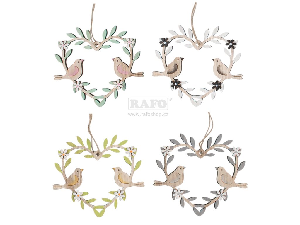 Dekorace dřevěná, závěsná, Srdce a ptáčci