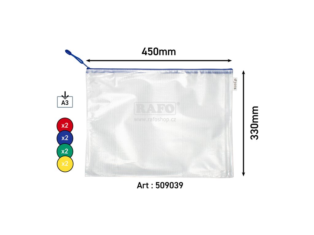 Vysoce odolná, poloprůhledná obálka se zpevňující síťovinou v atraktivních barvách. Vhodná pro tematickou organizaci dokumentů, školních pomůcek nebo větších předmětů. Barevný kovový uzávěr zipu s poutkem pro snadnou manipulaci. Boční poutko s logem je vhodné k uchycení pera. • rozměry: 330 × 450 mm, zapínání shora • materiál: odolné PVC (230 µm) • odolné proti roztržení • bez obsahu ftalátů • barva dodána dle aktuální skladové dostupnostiDoplňkové parametry
