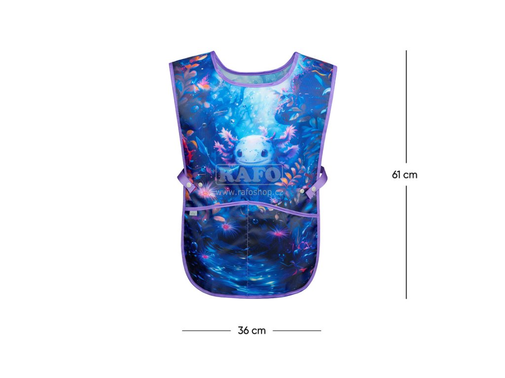 Dětská zástěra na výtvarnou výchovu s mysteriózním motivem axolotla poskytuje nejen inspiraci k tvorbě uměleckých děl, ale i ochranu před ušpiněním během jejich vzniku. • Dětská zástěra na výtvarnou výchovu, pracovní činnosti a další kroužky. • V dolní části zástěry jsou dvě kapsy. • Vyrobeno z omyvatelného materiálu. Velikost: 61 x 36 cm • 100% PolyesterDoplňkové parametry