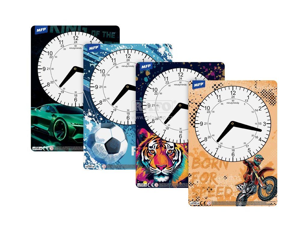 Dětské papírové hodiny v mixu chlapeckých motivů. Didaktická pomůcka, dobře využitelná k výuce času u dětí předškolního věku nebo u prvňáčků. Tyto cvičné hodiny nesmí chybět Vašemu dítěti při nástupu do první třídy základní školy. Rozměr: 210 x 300 mm. Dodáváme v mixu po 4 ks dle skladové zásoby.Doplňkové parametry
