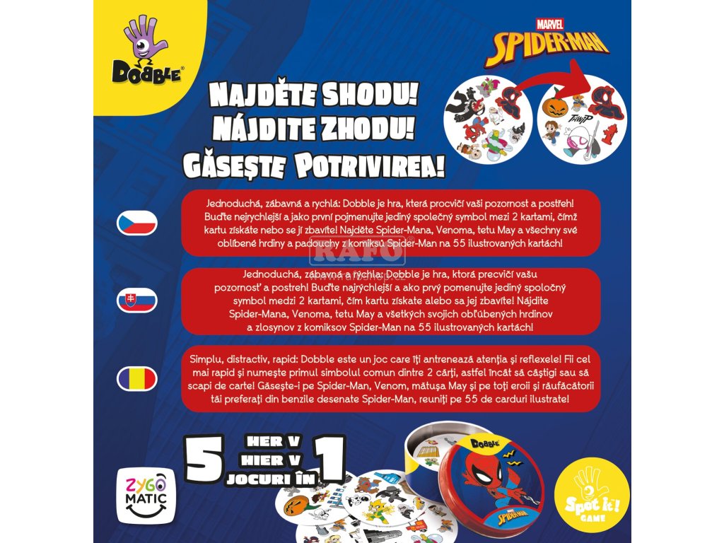 Jednoduchá, zábavná a rychlá: Dobble je hra, která procvičí vaši pozornost a postřeh! Buďte nejrychlejší a jako první pojmenujte jediný společný symbol mezi 2 kartami, čímž kartu získáte nebo se jí zbavíte! Najděte Spidermana, Venoma, tetu May a všechny své oblíbené hrdiny a padouchy z komiksů Spider-Man na 55 ilustrovaných kartách!