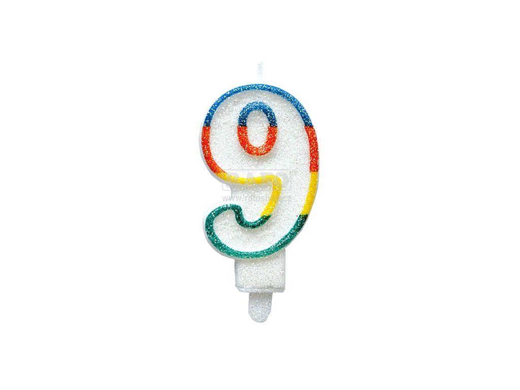 Narozeninová dortová svíčka ve tvaru čísla 9. Vynikající pro zdobení dětských dortů. Rozměr svíčky je 9 cm x 3,5 cmDoplňkové parametry