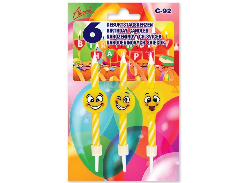 6 ks narozeninových svíček- emotikonů. Tyto svíčky nesmí chybět jako dekorace na žádném dortu. Především dětí ocení veselé obličeje emotikonů.Doplňkové parametry