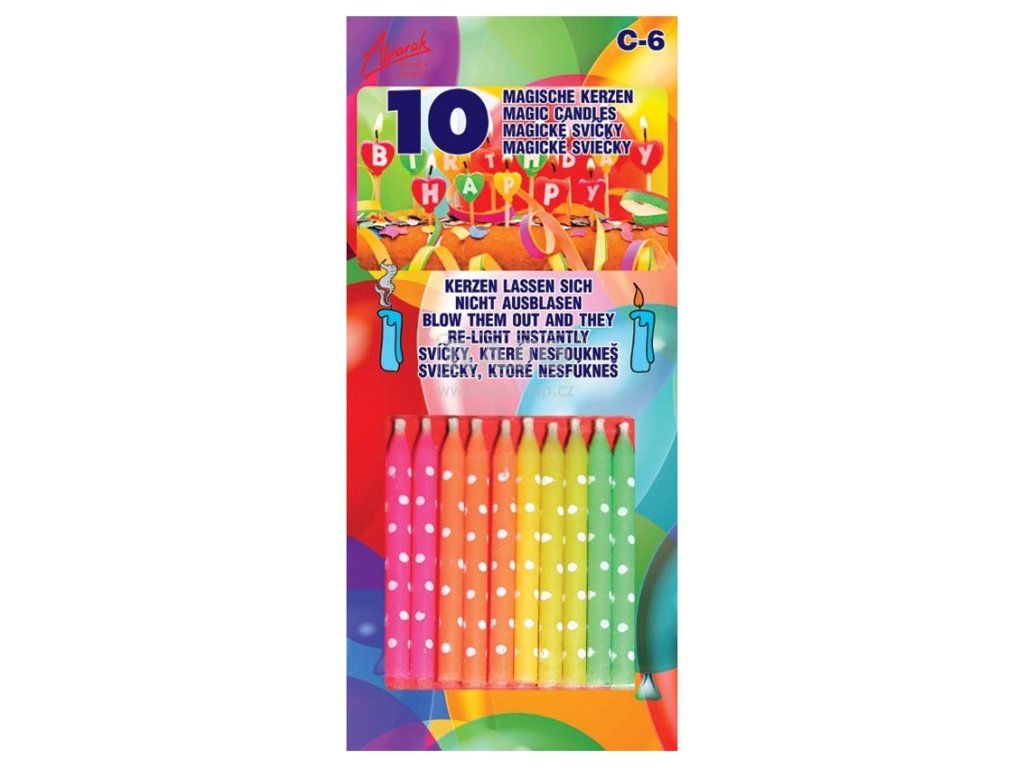 Nesfouknutelné svíčky jsou veselým a originálním dárkem především k narozeninové párty. Tyto zvláštní svíčky můžete klidně umístit na dort a při oslavě je nechat oslavencem sfouknout. To je ale téměř nadlidský úkol, protože ať už na dortu bude svíčka jedna nebo dvacet, jen tak se sfouknout nedají a oslavenec se při tom pořádně zapotí. Po tom, co se mu totiž podaří plamínek sfouknout, svíčky se opět rozhoří. V balení najdete 10 ks těchto svíček 6cm vysokých s 10 stojánky.Doplňkové parametry