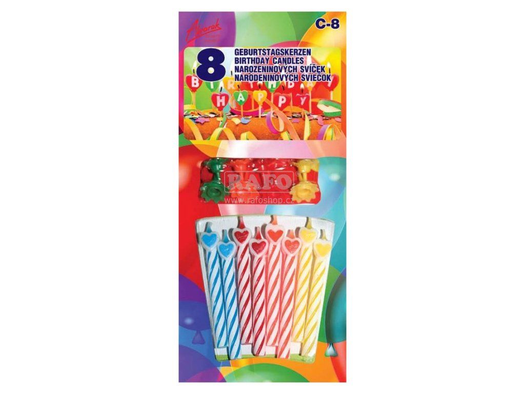 8 narozeninových svíček se srdíčky 6 cm vysokých s 8 stojánky.Doplňkové parametry