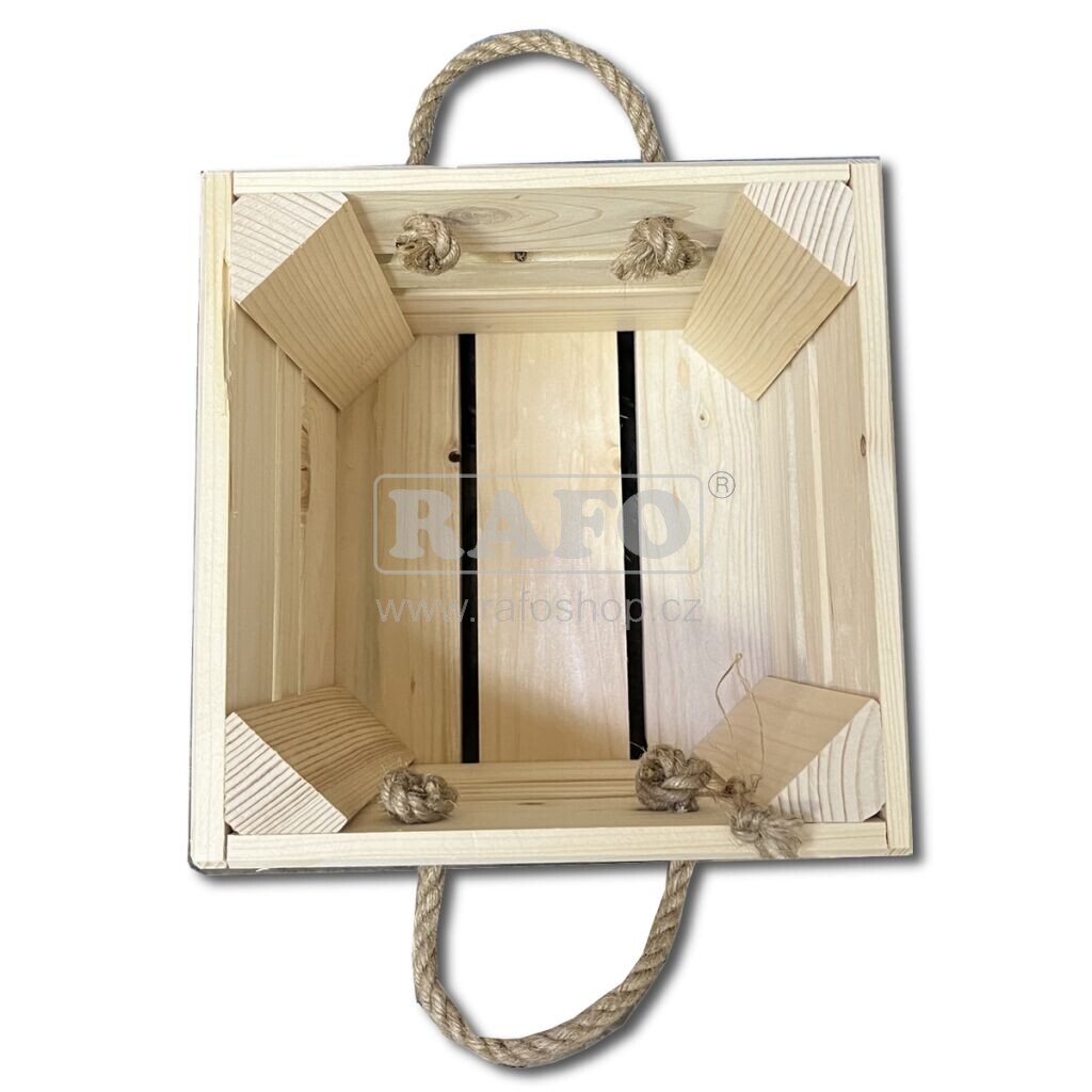 Dřevěné bedýnky "lískovky" jsou vyrobeny ze smrkového/borovicového dřeva z českých lesů a mají jutové úchyty pro pohodlnou manipulaci. Rozměr 190 x 190 x 180 mm