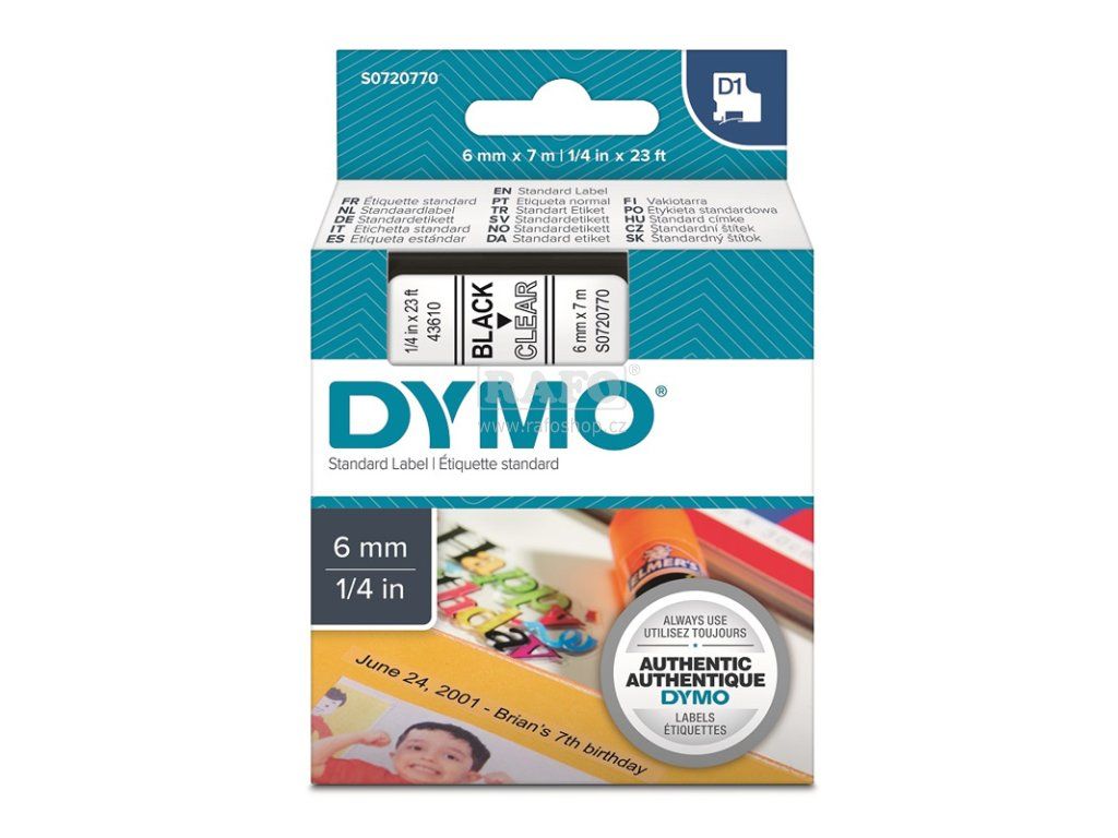 Samolepící pásky DYMO zaručují velmi snadnou aplikaci, podélné naříznutí papírového podkladu umožnuje pohodlné oddělení štítku, Pásky lze nalepit na téměř všechny čisté a rovné povrchy, jsou odolné proti vodě, teplotám od -30 do +150°C ,olejům,saponátům a většině rozpouštědel.Doplňkové parametry