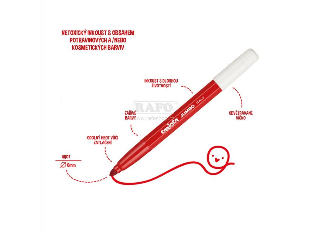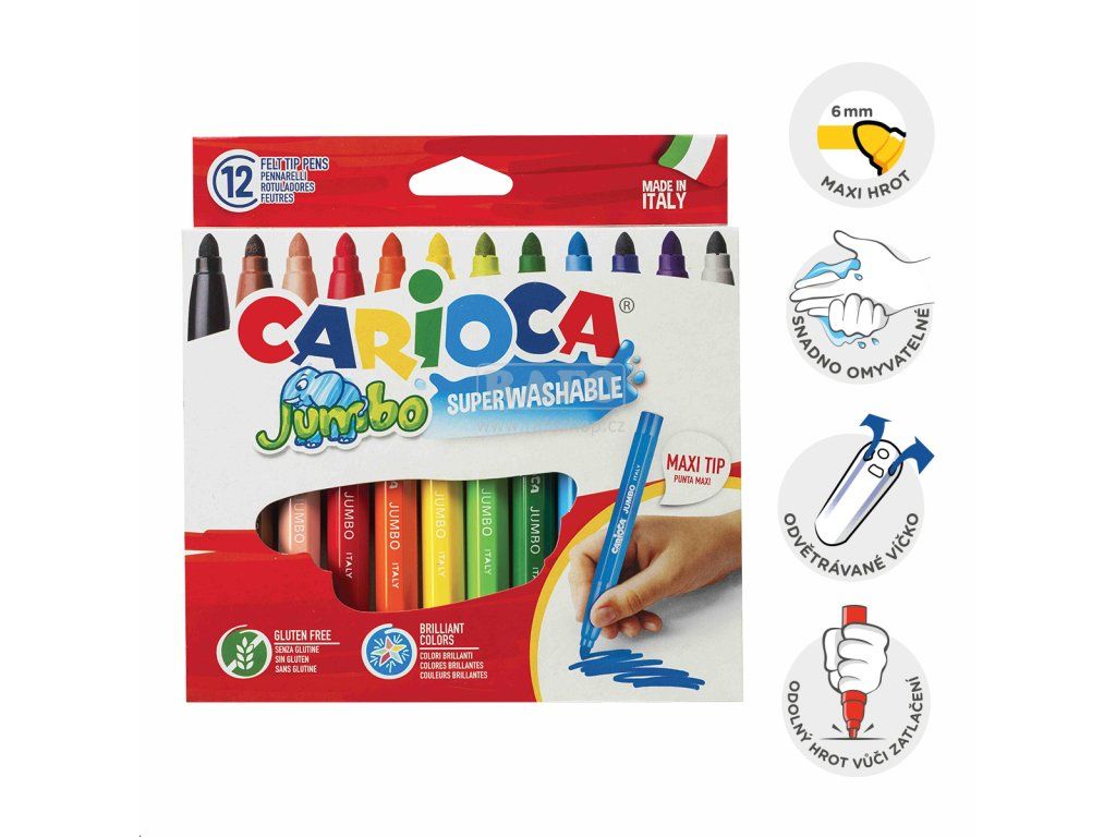 Fixy od italské značky Carioca přináší moře nekonečné a bezpečné zábavy. Hodí se pro malé umělce ve věku od 5 do 9 let. Pomocí vody je snadno odstraníte z kůže, lze je snadno vyprat nebo setřít z povrchů, což ocení hlavně maminky malých tvořitelů. Zpevněný hrot je odolný proti zatlačení a poradí si i s větším tlakem dětských ručiček. Kvalitní inkoust s dlouhou životností, jasné a zářivé barvy, které vnesou každé kresbě skutečný život. Netoxické a šetrné složení s obsahem potravinových a kosmetických barviv. Odvětrávané víčko pro bezpečné užívání, dermatologicky testované. Fixy Jumbo s extra silným hrotem. Osmiúhelníkový tvar těla v maxi tloušťce pro snadné držení a zacházení. Vhodné pro běžné kreslení, do škol nebo výtvarných kroužků. Nevhodné pro děti do 3 let. • odolný, extra silný hrot: o 6 mm • maxi osmihranný tvar těla • dermatologicky testované, neobsahují lepekDoplňkové parametry