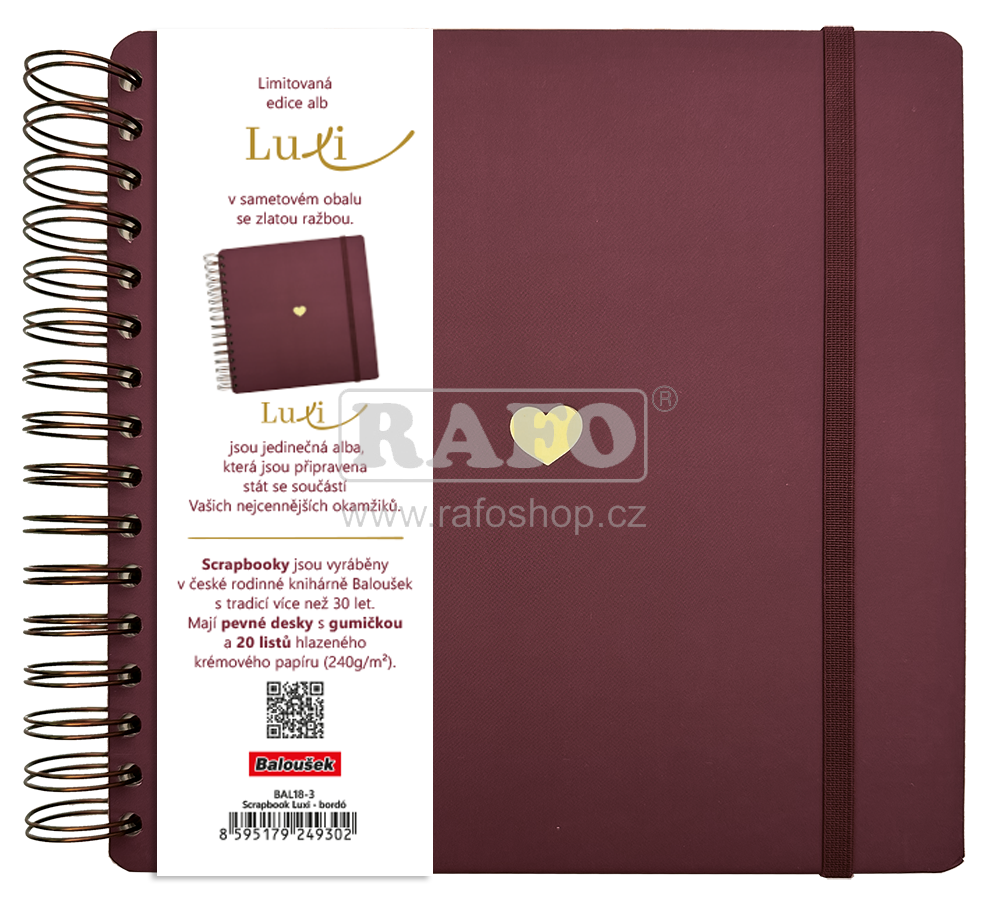Limitovaná edice scrapbooků se sametovým přebalem v moderní bordó barvě a se zlatým motivem Srdce. Luxi jsou jedinečná alba s krémovým papírem, kroužkovou vazbou a s gumičkou pro všechna Vaše tvoření. Do alba lze vlepovat fotografie nebo si do něj zapisovat všechny Vaše myšlenky. Naše alba jsou nejen krásná na pohled, ale také trvanlivá a připravená stát se součástí Vašich nejcennějších okamžiků. Vytvořte si svou vlastní unikátní sbírku vzpomínek s našimi luxusními scrapbooky.