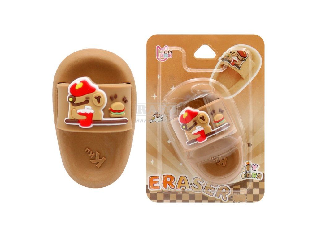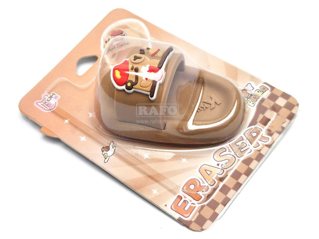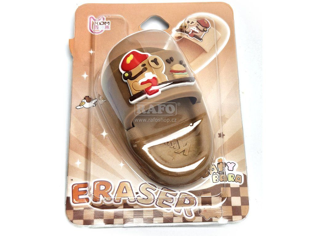 Syntetická guma - školní pomůcka v podobě letní pantofle pro gumování grafitových tužek a barviček. • rozměr: 65 x 35 x 30 mm • motiv: capybara s nápojem a hamburgerem • vhodné do školy i kanceláře
