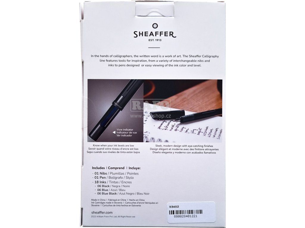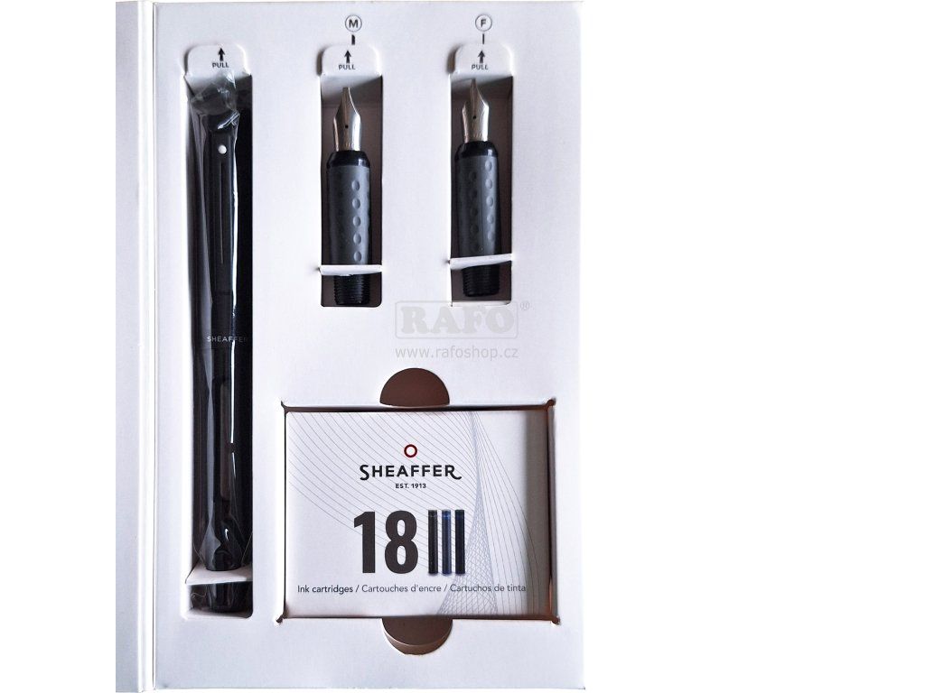 Nechte se inspirovat řadou plnicích per Sheaffer Calligraphy, které vám pomůžou proniknout do kaligrafie a krasopsaní. K dispozici je několik typů hrotů. Co najdete v balení: • 3 hroty různých šířek stop (1.0, 1.5 a 2.0 mm) • tělo pera a víčko • 18 bombiček s inkoustem (6 černých, 6 modrých, 6 modro-černých)Doplňkové parametry