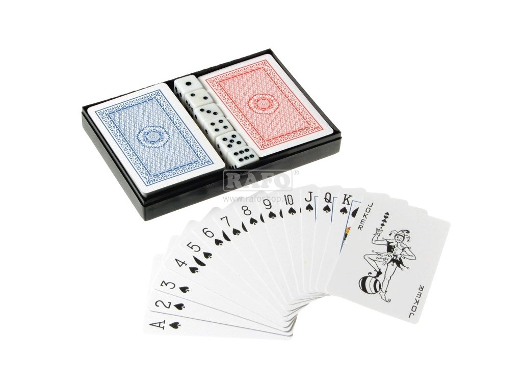 Karty na canastu, poker, žolíky apod. V praktickém plastovém pouzdře s šesti kostkami. Počet karet: 108.Doplňkové parametry
