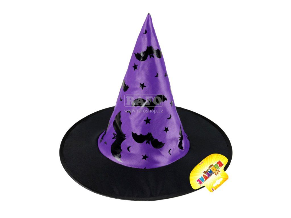 Dětský kouzelnický klobouk fialové barvy zdoben s potiskem netopýrů. Vhodné na party, oslavy, maškarní, pálení čarodějnic, Halloween, karnevaly atp.Doplňkové parametry