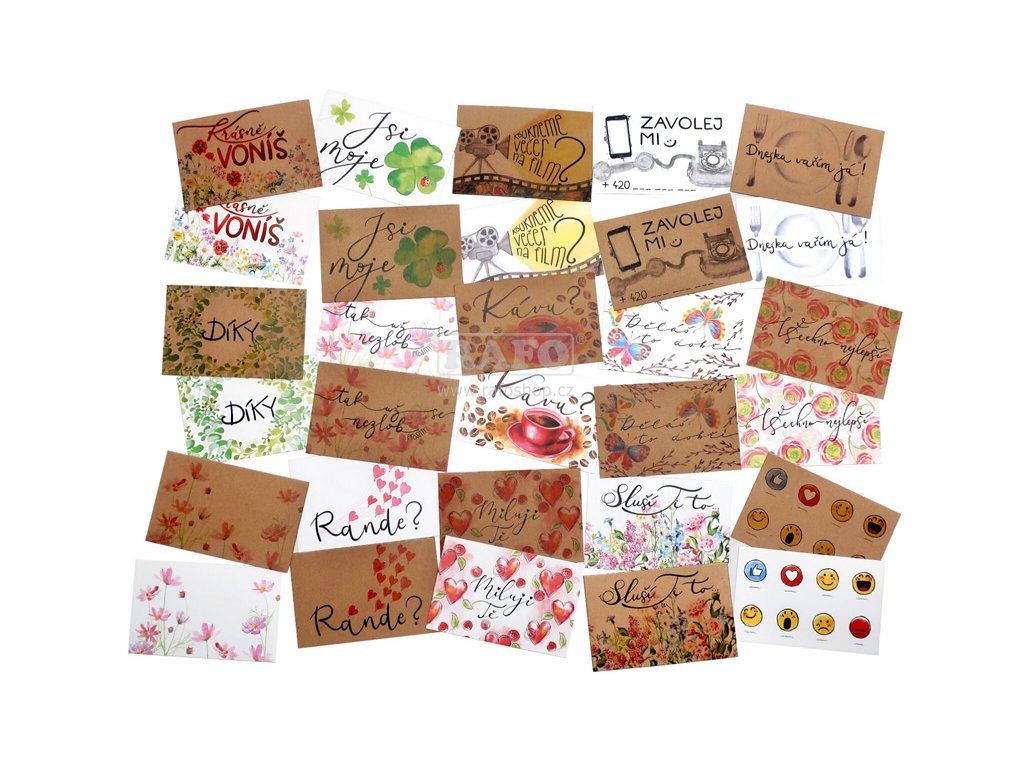 Chceš někomu nechat milý vzkaz? Poděkovat? Nebo jen jednoduše zlepšit náladu a udělat hezčí den? Přesně proto jsou tady naše komplimentky - papírové kartičky, na kterých jsme ti připravili nejrůznější vzkazy. Šiř kolem sebe lásku a dobrou náladu. Udělej svět krásnější :) K dispozici máš 15 kartiček na bílém a 15 kartiček na kraftovém papíře. Pojďme být k sobě o něco blíž. Rozměr 85 x 55 mmDoplňkové parametry