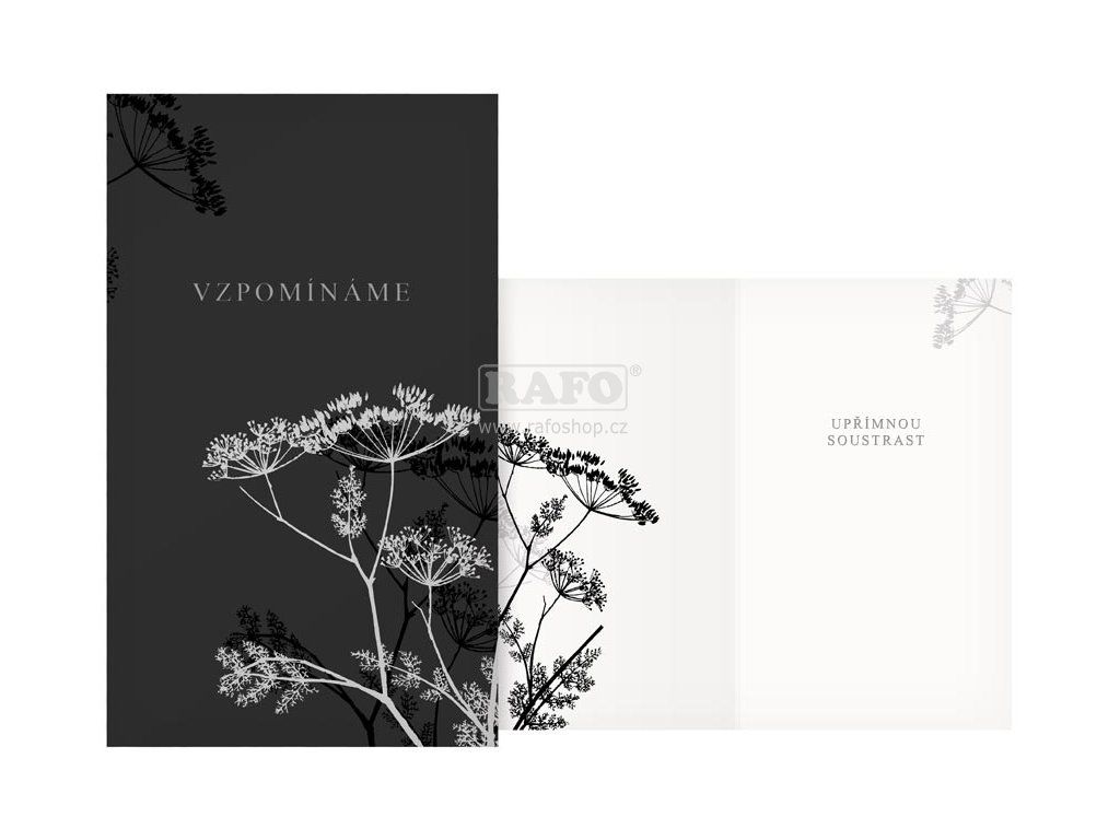 Decentní kondolenční přání menšího formátu s elegantním černobílým motivem luční rostliny přináší prostor pro vzpomínku i soucit. Minimalistické provedení s jemným kontrastem tmavého pozadí a světlého vnitřku působí velmi klidně a důstojně. Vnitřní text vyjadřuje upřímnou soustrast jednoduše a s respektem.