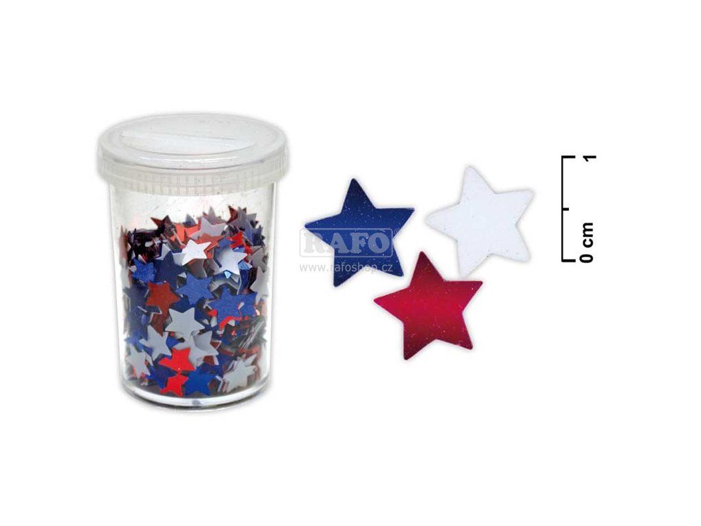 Konfety hvězdičky. vhodné pro výzdobu místnosti, stolů, pro výrobu vánočních dekorací, sportovních akcí aj. BALENÍ OBSAHUJE: - barevné lesklé hvězdičky (červená, modrá, bílá) Konfety jsou baleny v plastové kulaté krabičce s uzávěrem.Doplňkové parametry