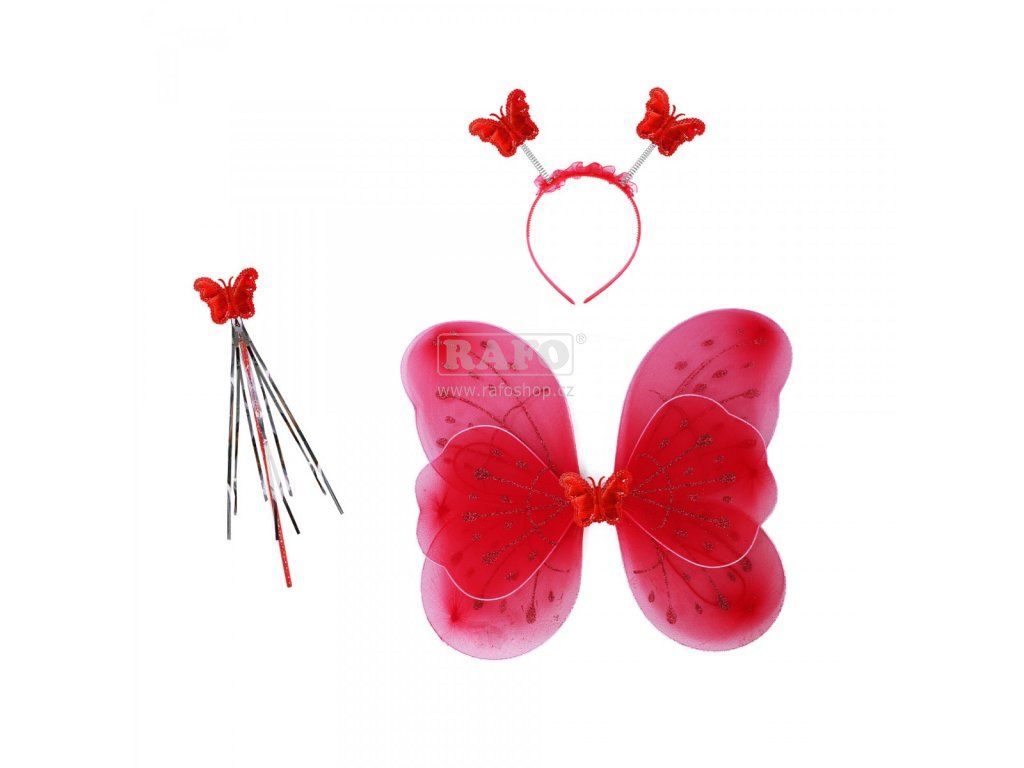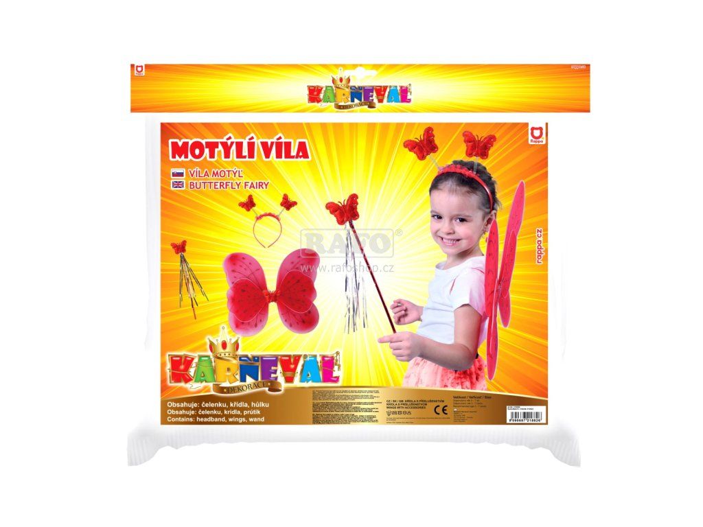 Roztomilá červená motýlí křidélka na gumičku jsou určena pro holčičky ve věkovém rozmezí 3-10 let (104-150 cm). Součástí této karnevalové sady je také čelenka s motýlky na pružinkách a hůlka.Doplňkové parametry