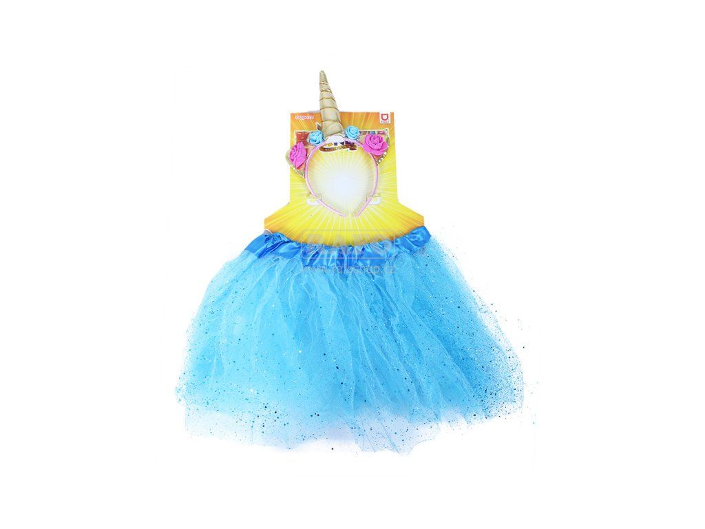 Karnevalový kostým pro malé princezny, které milují jednorožce. Světle modrá třpytivá sukénka velikosti cca 3-10 let, obvod pasu 48-80 cm, délka cca 26 cm. Součástí této sady je také senzační čelenka jednorožce se zlatým rohem a ušima. TIP NA DÁREK!Doplňkové parametry