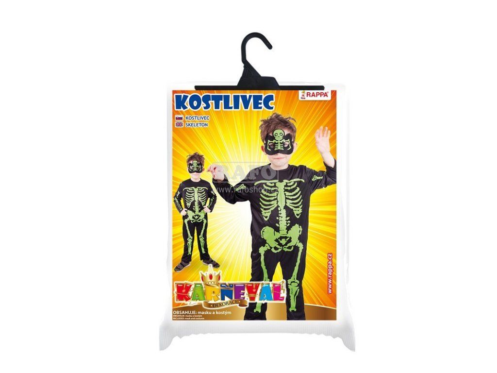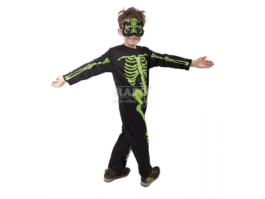 Strašidelný karnevalový kostým ideální na haloween s motivem kostlivce! Kostým ve velikosti M je určen pro chlapečky ve věkovém rozmezí cca 6-8 let. Balení obsahuje černou kombinézu a masku s motivem zeleného kostlivce.Doplňkové parametry