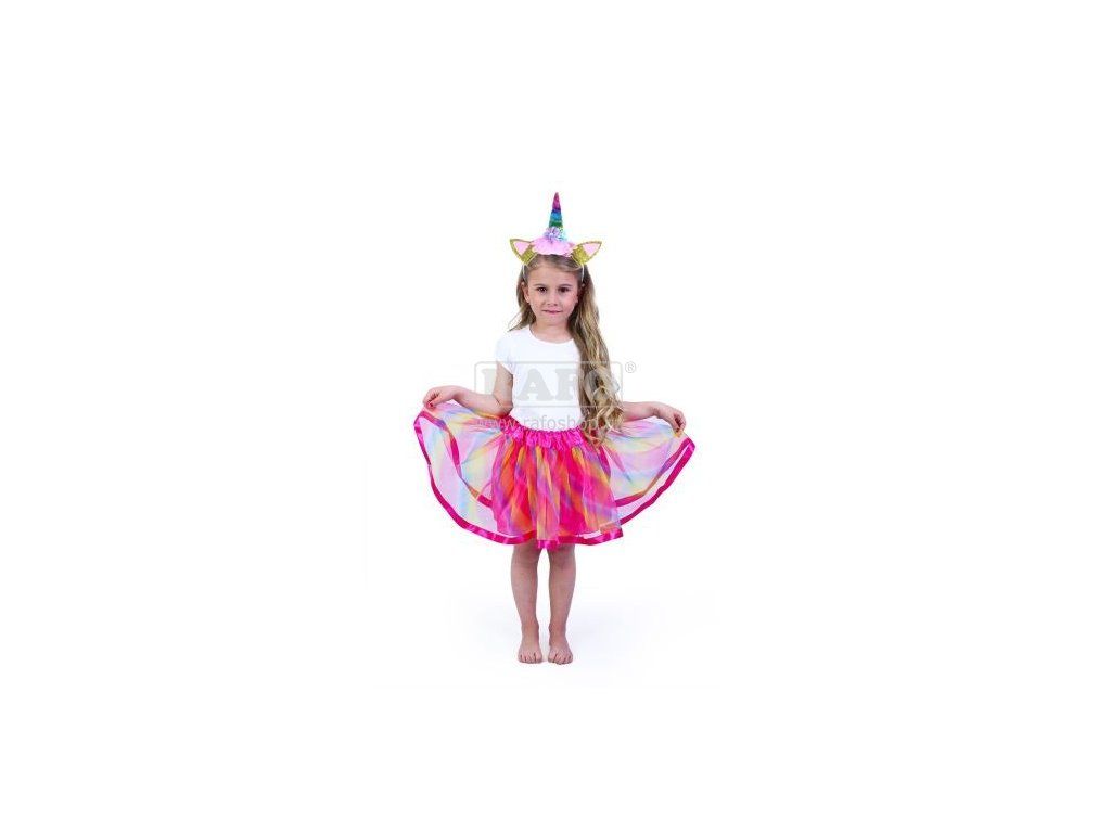 Tento úchvatný kousek v duhových barvách je zdoben saténovým lemováním. Součástí této sady je senzační čelenka jednorožce se zlatým rohem a barevnými růžemi! 3 - 10 letDoplňkové parametry