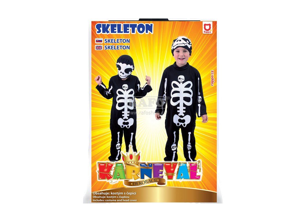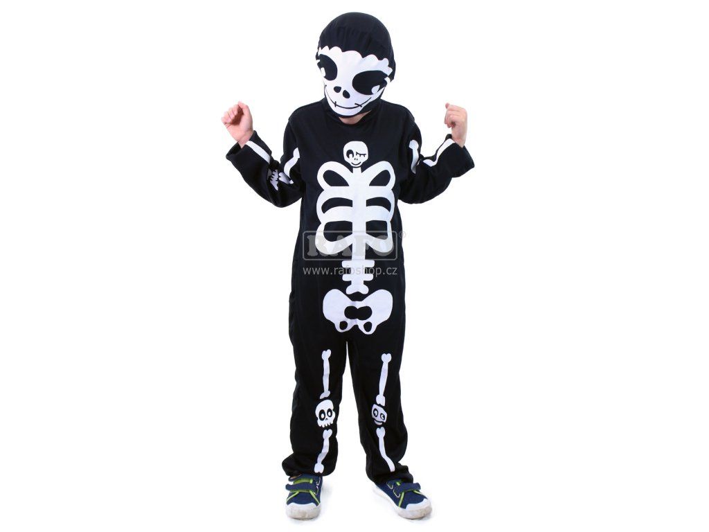 Strašidelný karnevalový kostým s motivem kostlivce! Kostým ve velikosti M je určen pro děti ve věkovém rozmezí 6-8 let (117-128 cm). Balení obsahuje černou kombinézu a masku s bílým potiskem kostry.Doplňkové parametry