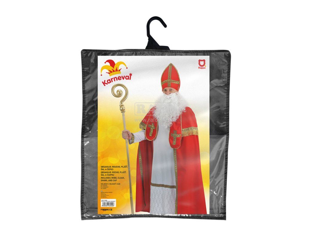 Exkluzivní karnevalový kostým Mikuláše pro dospělé. Kostým obsahuje mikulášskou čepici, dlouhé bíle roucho, červený plášť s límečkem a šerpu s křížem. Neobsahuje hůl ani vousy! Délka bílého roucha od ramen dolů je cca 140 cm.Doplňkové parametry