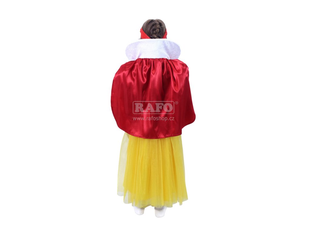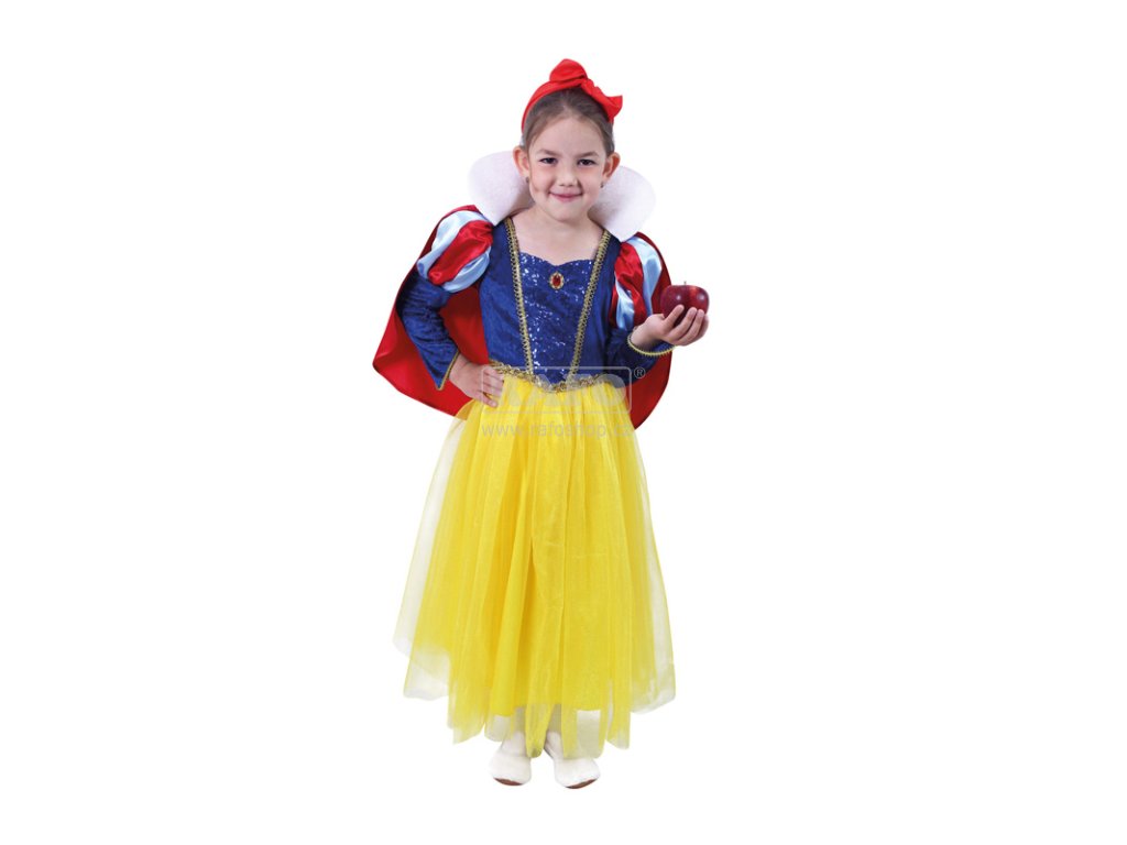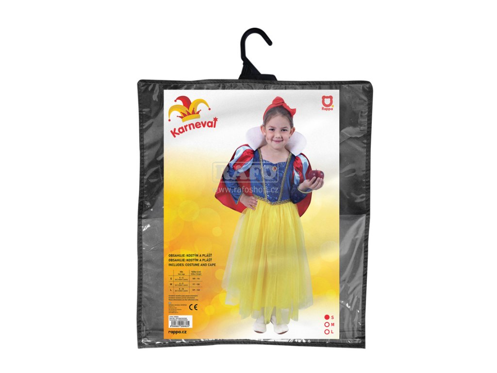 Proměň se během chvilky v půvabnou Sněhurku! Kostýmek o velikosti S je určen pro holčičky ve věkovém rozmezí 4-6 let (105-116 cm). Barevný kostým je dekorován v přední části modrými flitry a zlatým zdobením. Součástí je odnímatelný červený plášť s bílým límcem. Neobsahuje mašli do vlasů.Doplňkové parametry