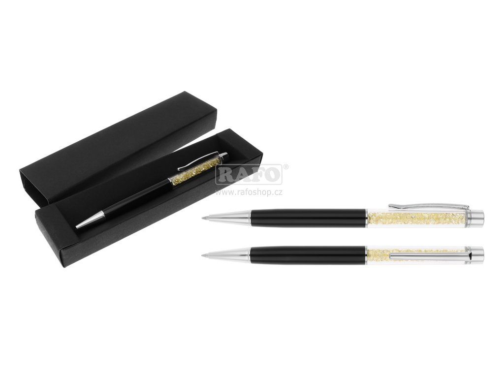 Kovové kuličkové pero s krystaly v papírové krabičce.