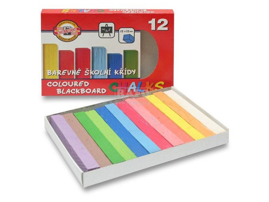 Souprava 12 kusů školních barevných čtyřhranných kříd o rozměrech 12x12x100 mm, které jsou určeny pro psaní na školní tabule, vložených do krabičky s potištěnou manžetou.Doplňkové parametry