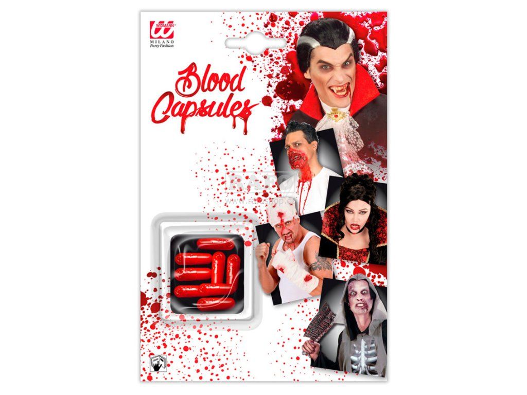 Umělá krev v kapslích (8 ks). Rozkousněte kapsli v zubech a její obsah nechte rozpustit slinami. Získáte tak kapalinu velmi podobnou krvi. Výrobek pro scénografické použití. Složení krvavých kapslí: Kyselina citrónová, jedlá soda, potravinářské barvivo, kukuřice setá. Skvrny od umělé krve lze vyprat vodou a mýdlem.Doplňkové parametry